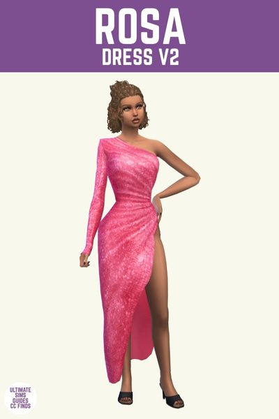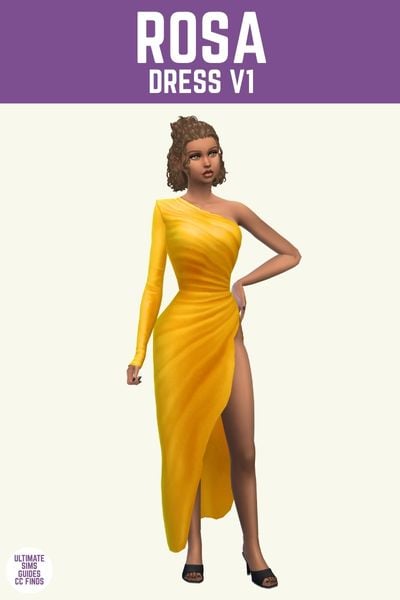 Rosa is a really pretty one arm dress with a huge slit showing off an entire leg which looks hot. It’s such a great option for a wedding guest dress or just a hot date your sim might be going on.