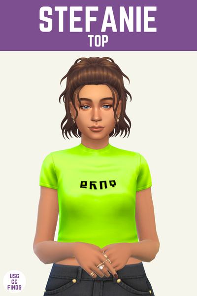 The Stefanie top is a really cute baby tee for your sims. It comes in a bunch of fun graphic designs from a cat holding a knife to an I Love New York shirt in a simlish font!