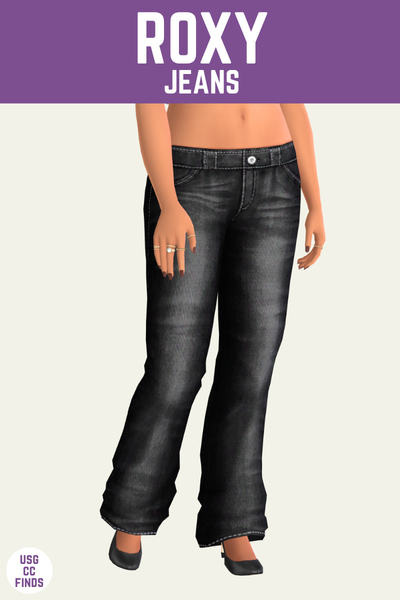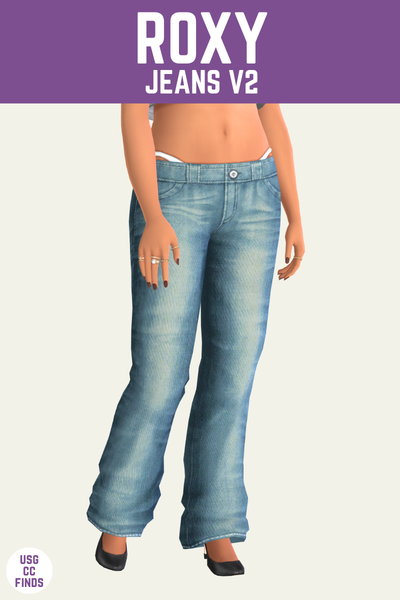 The Roxy Jeans V2 are the same pair of jeans with the same awesome swatches but they add one small detail which is very Y2K. This version has two straps coming from the sim’s under garments which was a huge thing in the early 2000s!