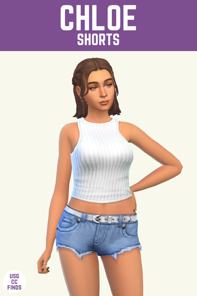 The Chloe shorts are a pair of short denim shorts. They have a fun frayed texture at the bottom which makes my brain think the sim cut them shorter than they were when they got them.