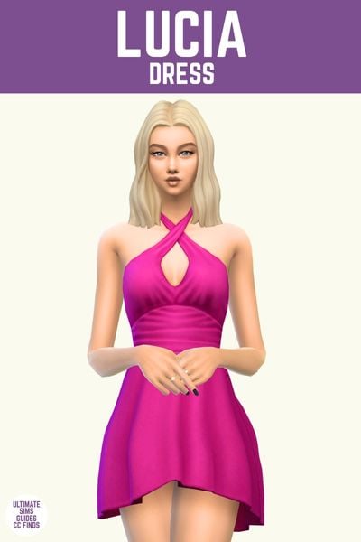 The Lucia Dress is so much fun and shows off your sim’s curves. I absolutely love the halter neckline look with the opening in the chest, it just looks so good. Plus, there are solid colour and fun floral swatches too.