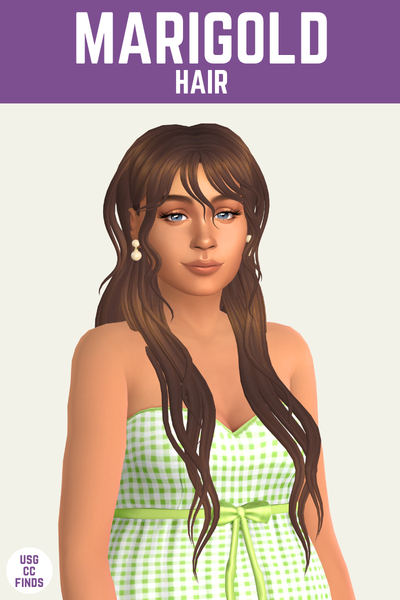 The Marigold hair is a cute middle-part hair look with bangs that are swooping around. It’s a great hair for showing off some cute earrings for sure!