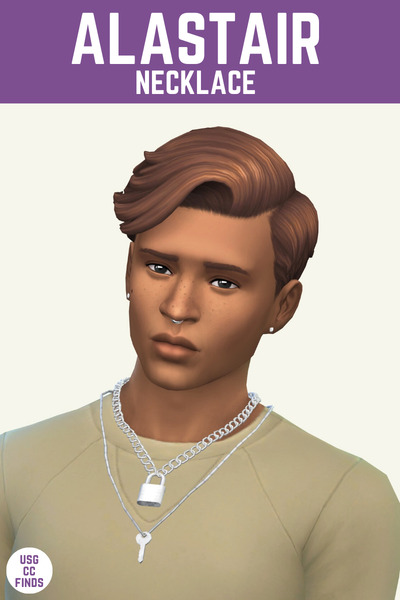 The Alastair necklace is a pretty masculine looking lock and key layered necklace. It comes in nice neutral metal tones that look really great. I’m really just loving this for my male sims lately.