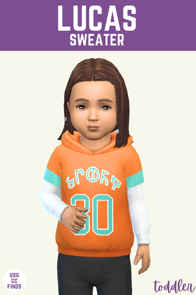 The Lucas hoodie is something that cool toddlers would wear. This has a hoodie with t-shirt length sleeves on top of a long sleeve shirt, there’s a jersey design on the chest in simlish which is so cute!