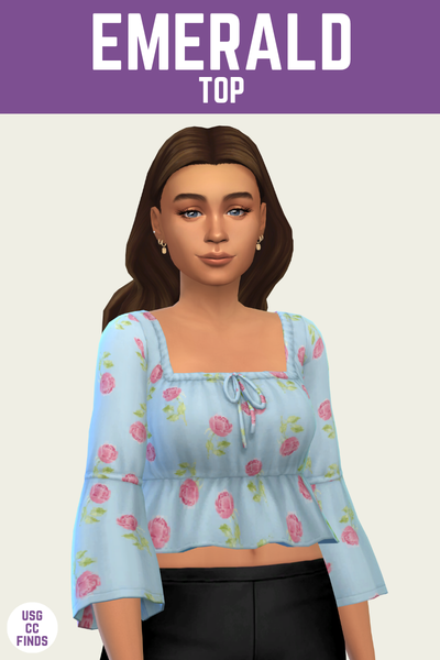 The Emerald Top is a pink square neck peplum top with roses all over. It looks really good with some high-waisted jeans!