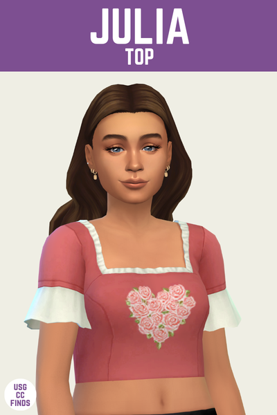Julia is a cropped shirt with a fun square neckline with a cute ruffle. It has a bunch of roses that are together in a heart shape which looks awesome.